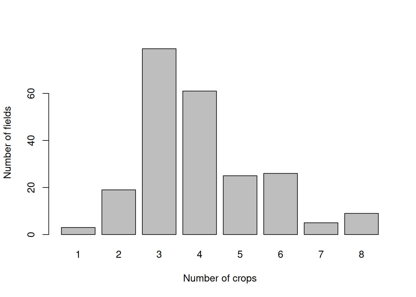 On most fields, there are between 3 and 4 different crops cultivated within the 2015-2023 period.