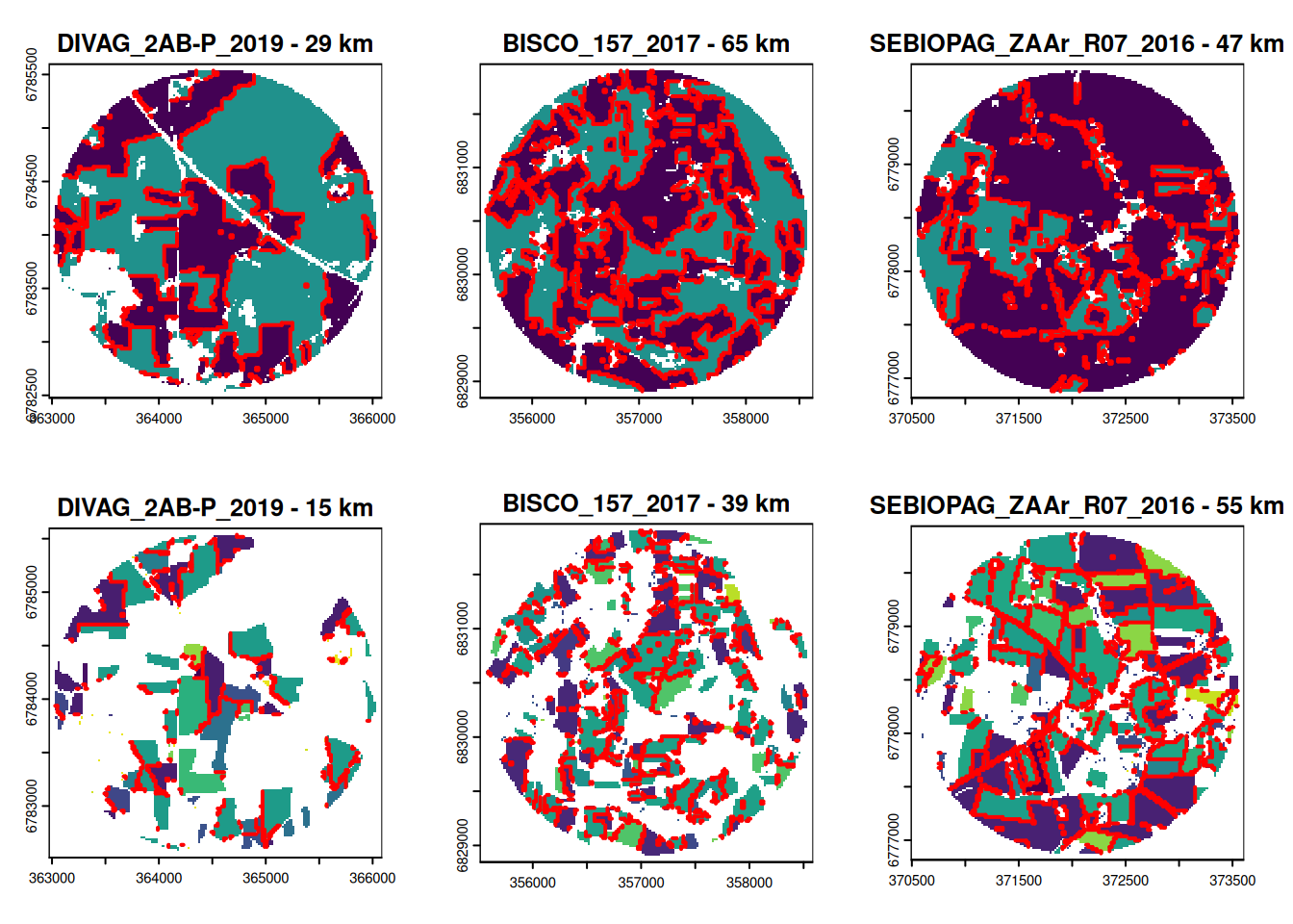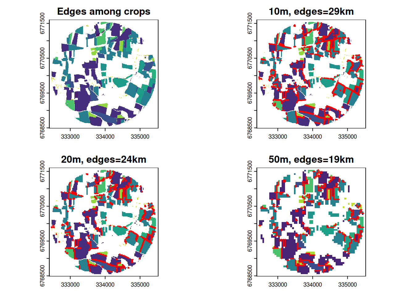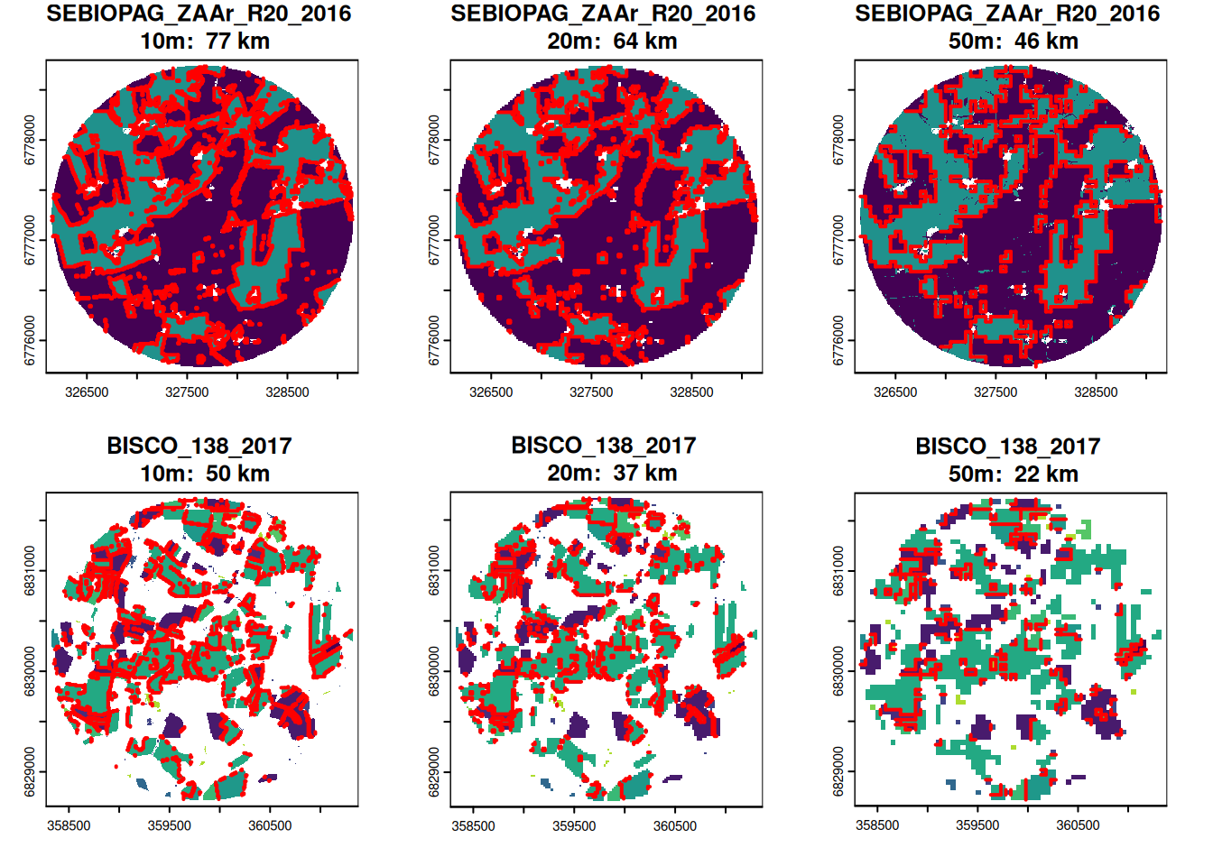 Les longueurs d’interfaces entre les cultures et les habitats semi-naturels ne sont pas corrélés avec les longueurs d’interfaces entre cultures. La résolution de 20m semble un bon compromis entre les résolutions à 10m et à 50m.