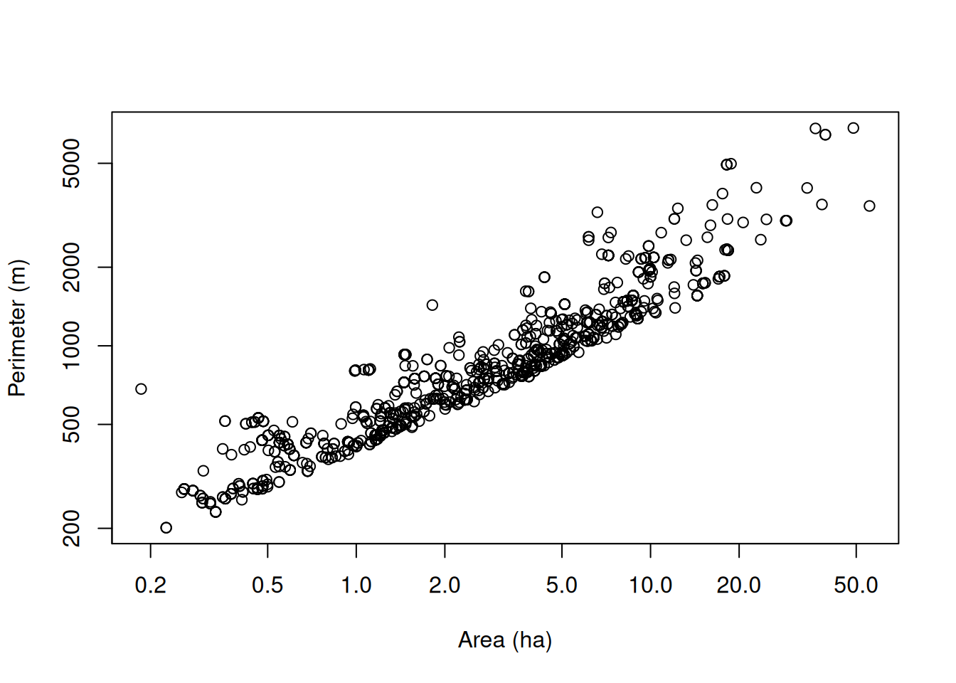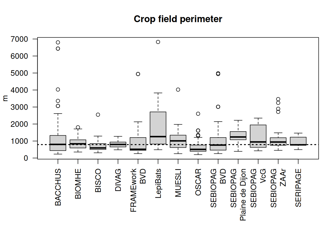 There is a strong relation between area and perimeter (Figure 6). In median, field size is 2.8 ha and field perimeter is 790m.