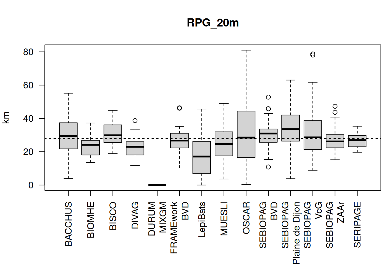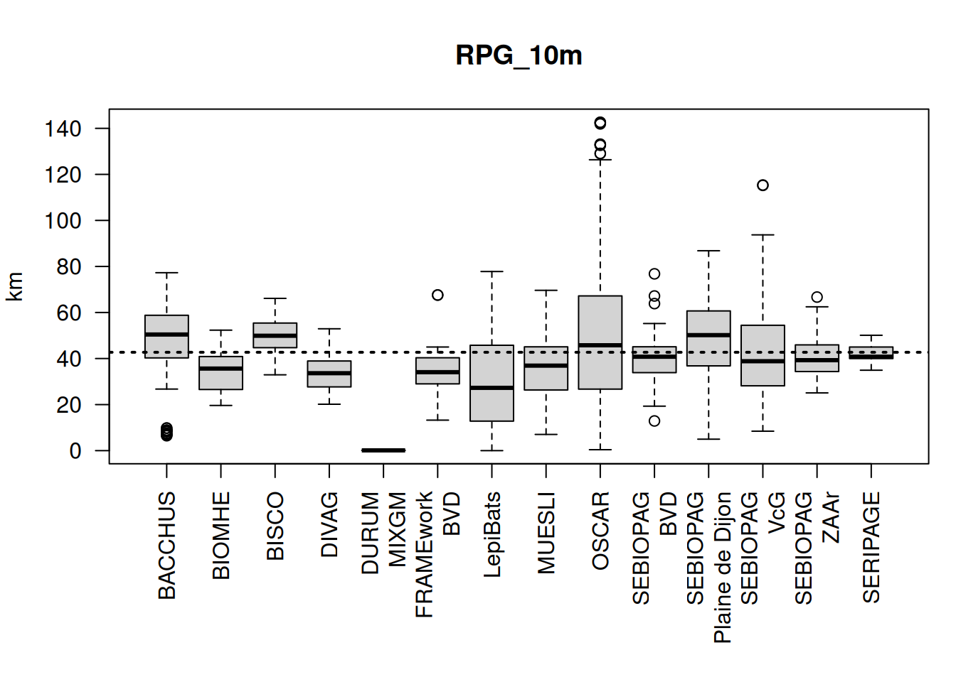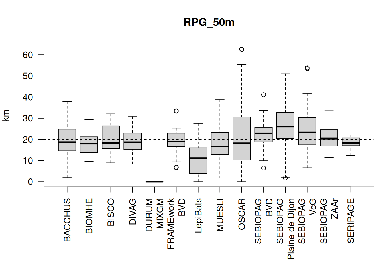 In average, roughly half of the buffer areas are filled with land cover classes from RPG (and the other half are OSO classes). The proportion of RPG classes slightly decreases with the size of the buffer (larger buffer includes less agricultural areas).