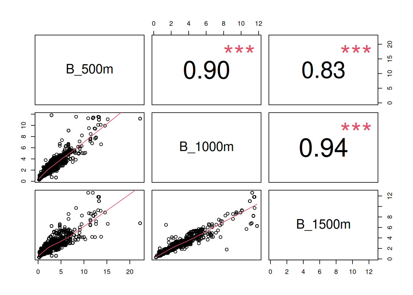 Without any grouping, there are 237 different categories covered by the 1500m buffers (Table 10). Theses categories need to be simplified before the land cover can be analyzed. The larger the buffer size, the higher is the number of different classes within the buffer.