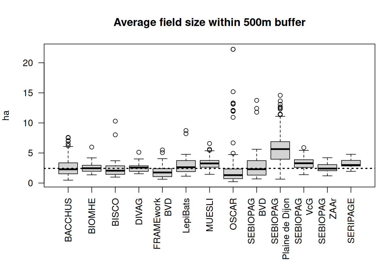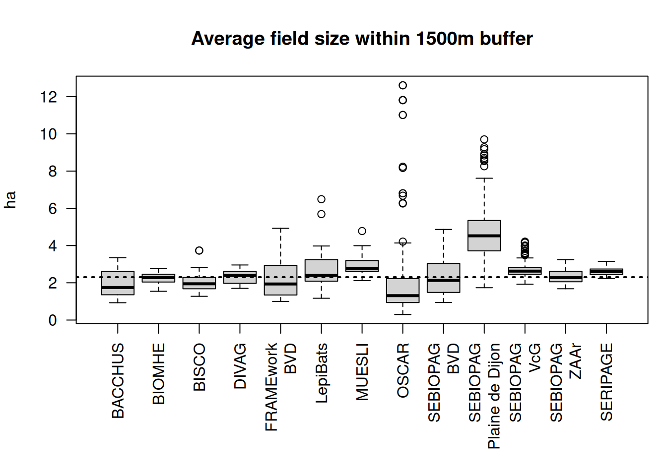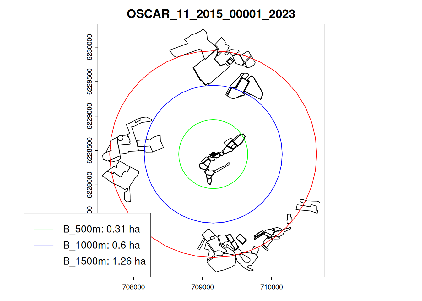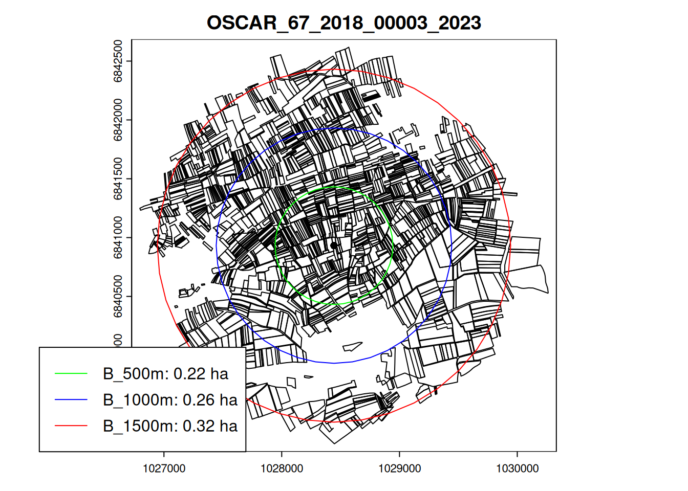 Using the coordinates of the sampling sites, we calculated the average area of all crop fields within a buffer (500m, 1000m, and 1500m).